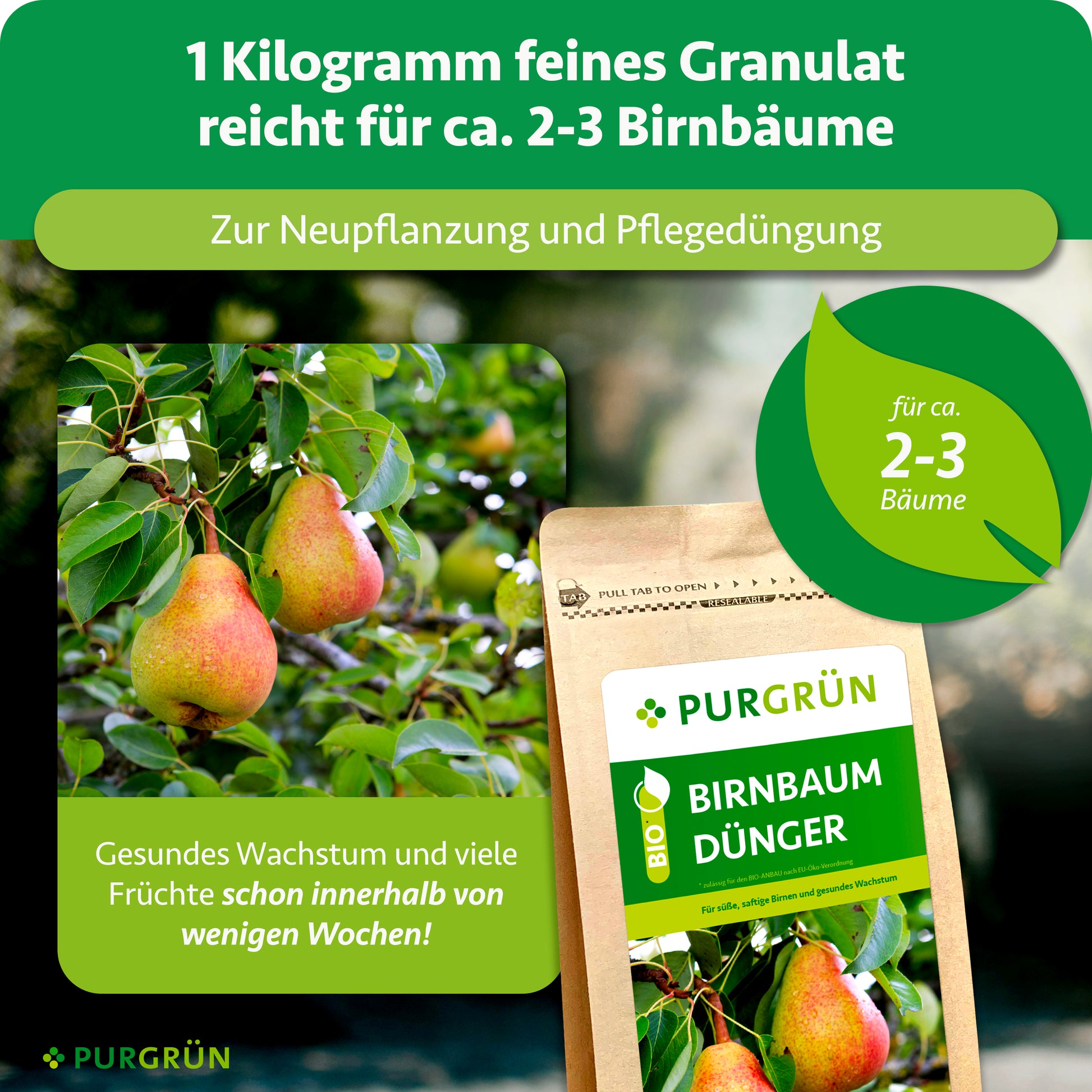 Dank der hohen Ergiebigkeit reicht eine Packung Purgrün Bio-Birnbaum-Dünger für ca. 10–15 m² Gartenfläche.