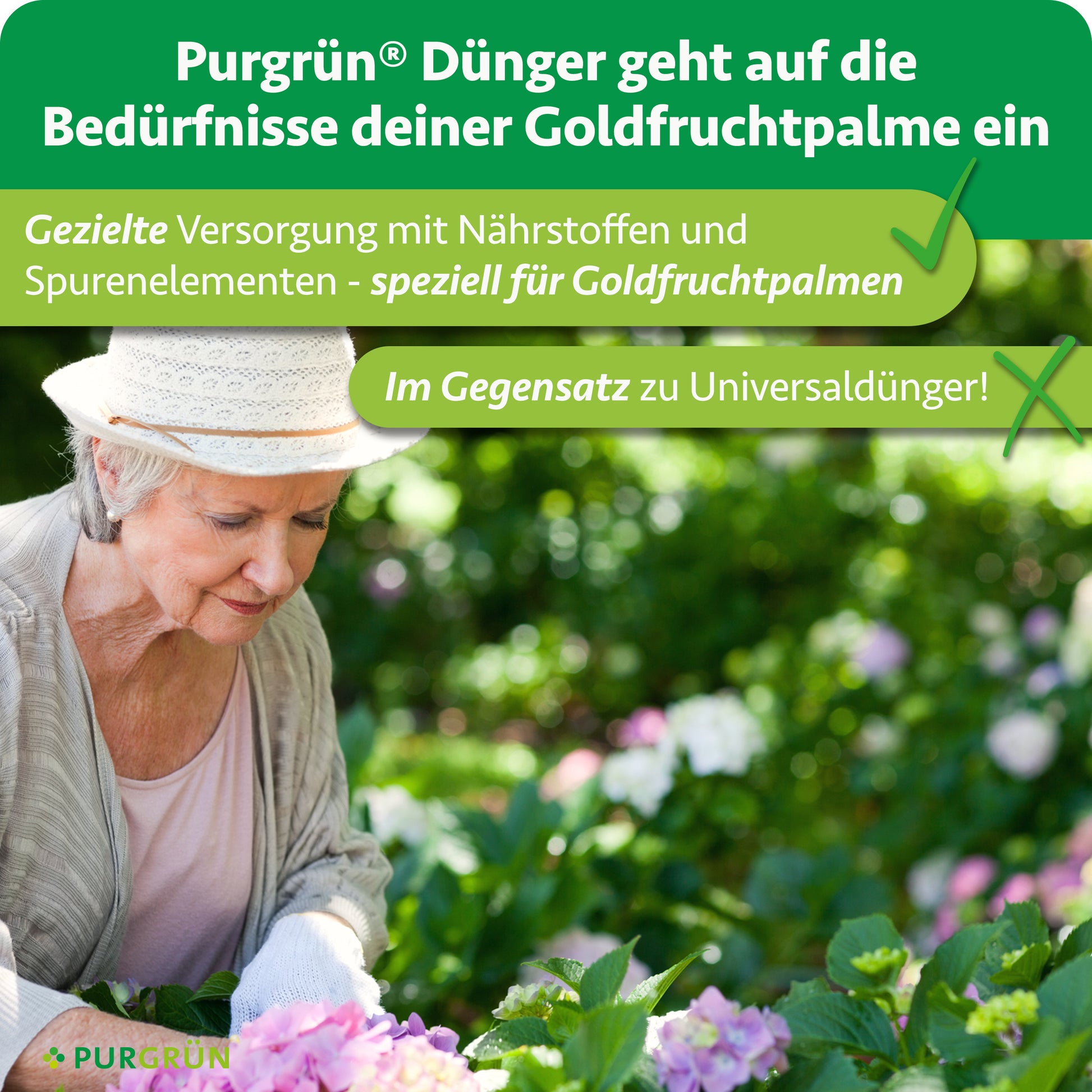 Der Purgrün Goldfruchtpalme-Dünger ist speziell formuliert, um Goldfruchtpalmen optimal mit allen wichtigen Nährstoffen zu versorgen. Die stickstoffbetonte Zusammensetzung versorgt die Pflanze mit allen notwendigen Haupt- und Spurennährstoffen, um ein kräftiges Wachstum und eine ausgezeichnete Gesundheit zu fördern.