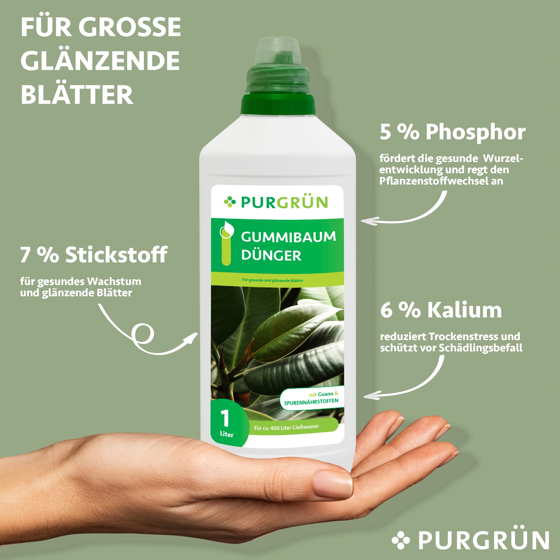 Der Purgrün Gummibaum-Dünger sorgt mit dem zugesetzten Guano und den Spurennährstoffen für eine gesunde Entwicklung und glänzende Blätter bei Ihrem Gummibaum.