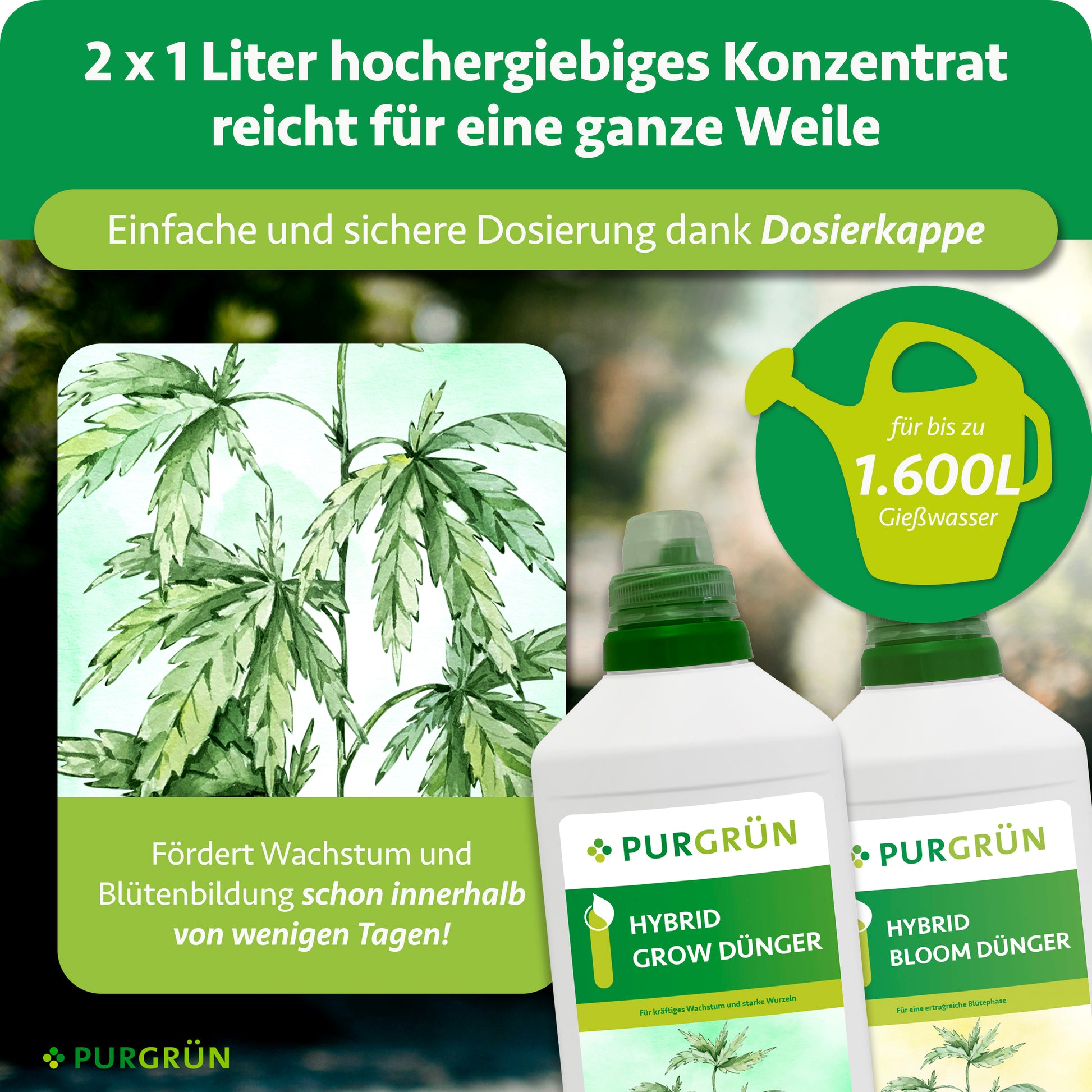 Dank der hohen Ergiebigkeit reicht eine 1-Liter-Flasche Purgrün Hybrid-Grow-Dünger für ca. 600 - 1.2000 Liter Gießwasser.
