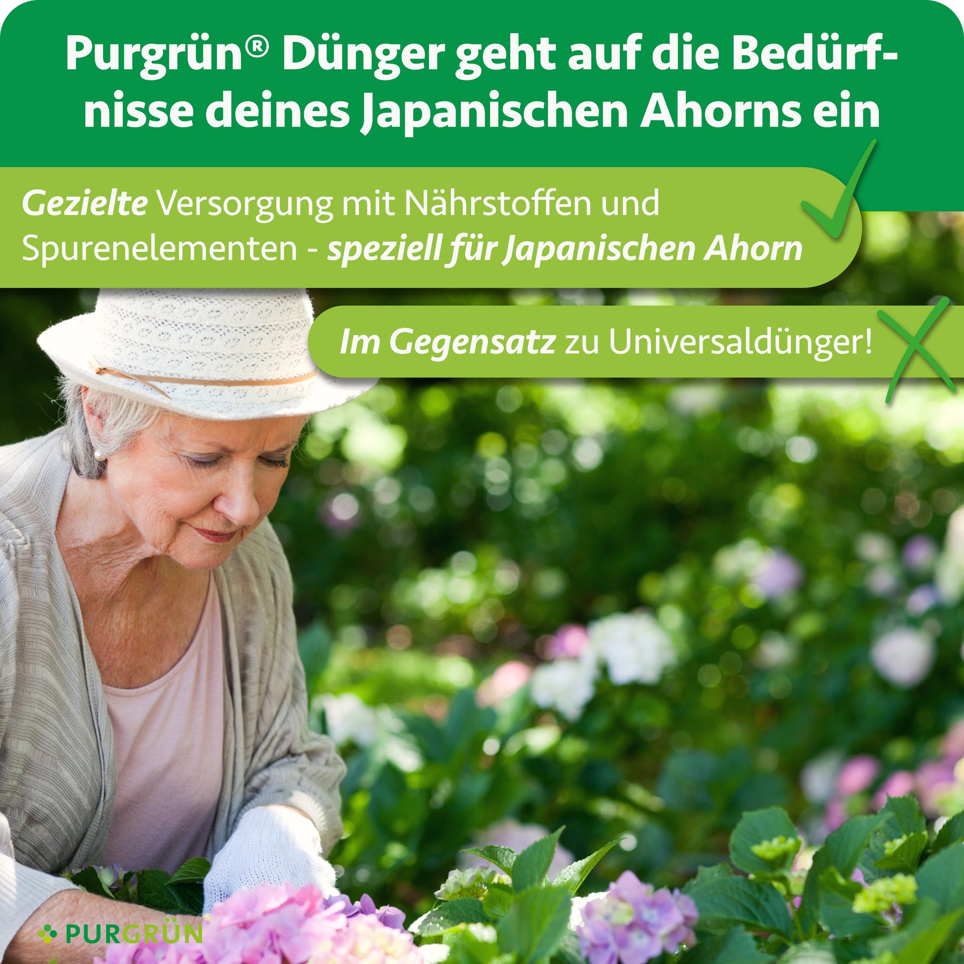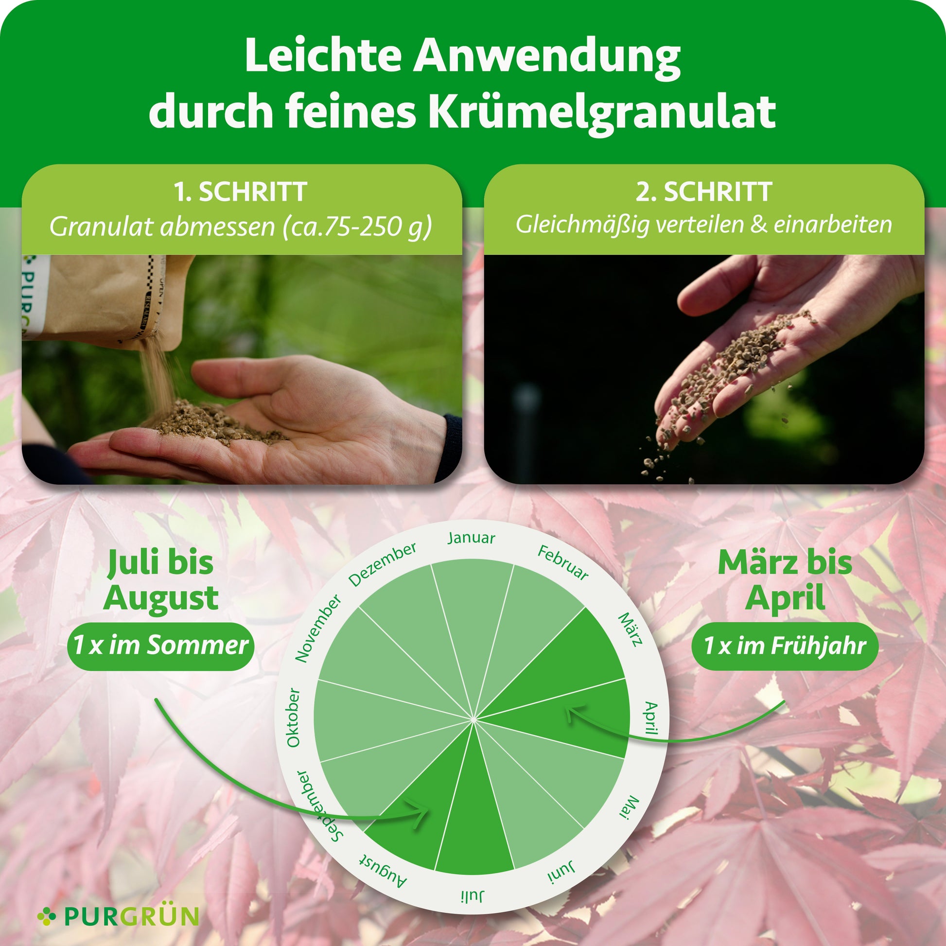 Der Purgrün Japanischer-Ahorn-Dünger ist speziell darauf ausgerichtet, die Entwicklung und Gesundheit Ihres Japanischen Ahorns zu fördern. Sein hoher Kaliumgehalt unterstützt die Blattbildung und stärkt Stämme sowie Äste.