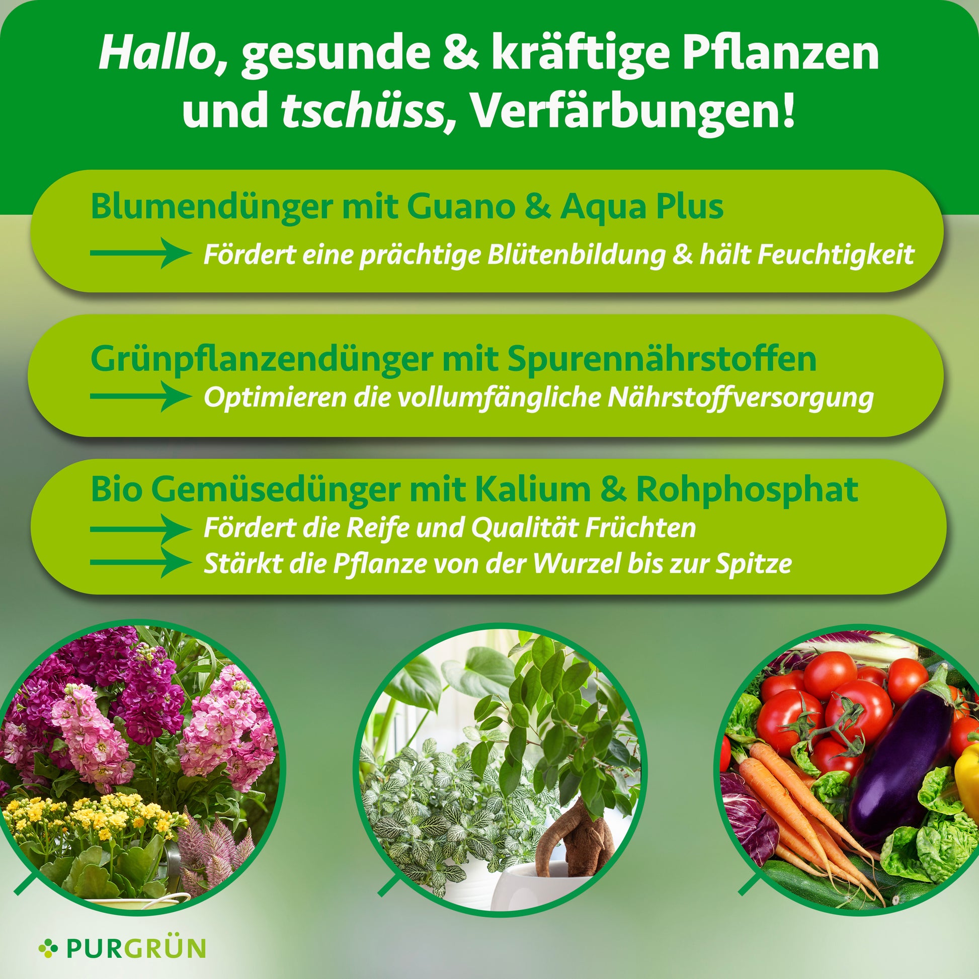 - Purgrün Grünpflanzendünger stärkt das Blattgrün, fördert dichtes Wachstum und beugt Mangelerscheinungen vor.