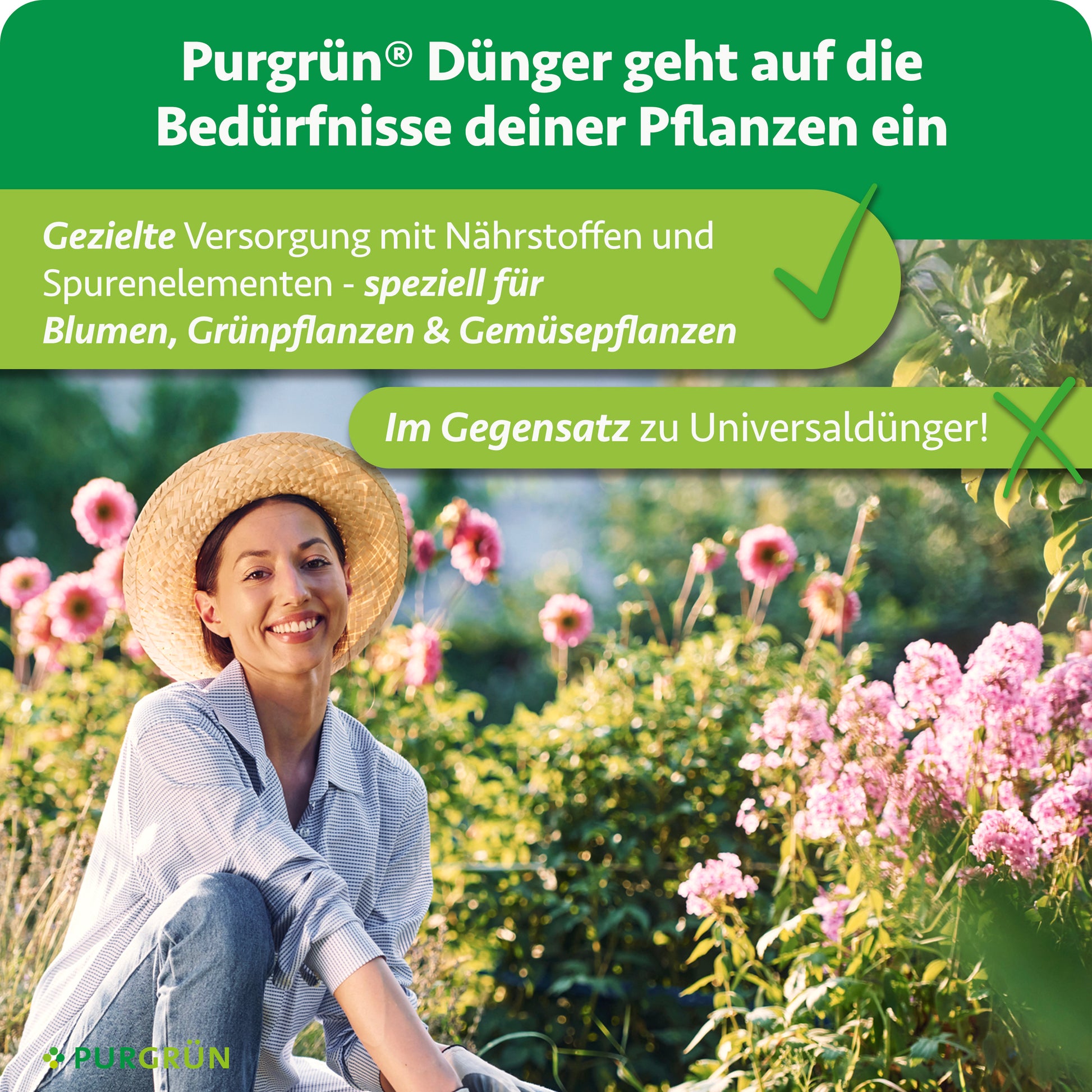 - Purgrün Blumendünger unterstützt eine lange, intensive Blütezeit und sorgt für leuchtende Farben.