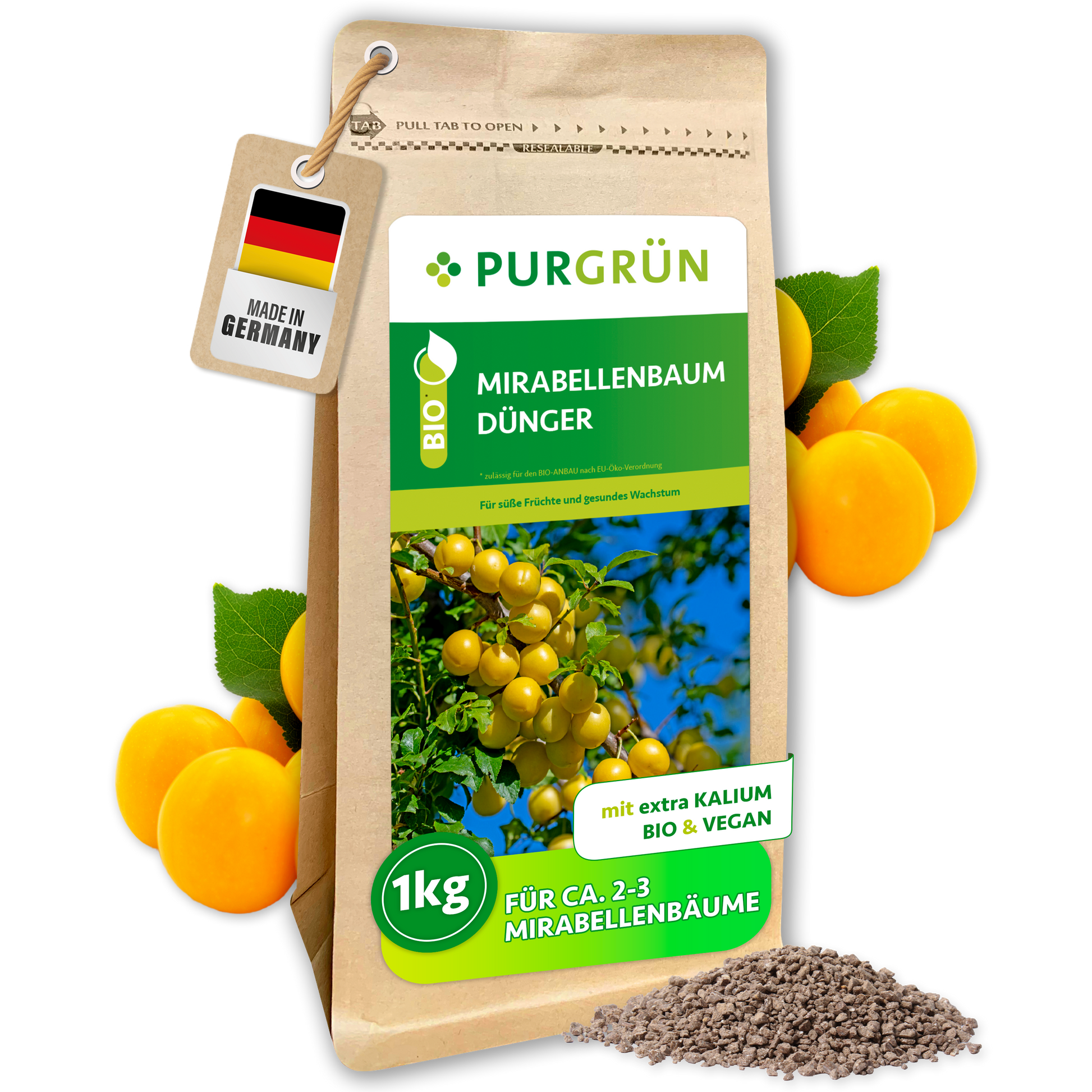 Da ausschließlich pflanzliche Rohstoffe verwendet werden, ist der Purgrün Bio-Mirabellenbaum-Dünger vollständig vegan und ideal für eine naturbewusste, nachhaltige Gartenpflege geeignet.