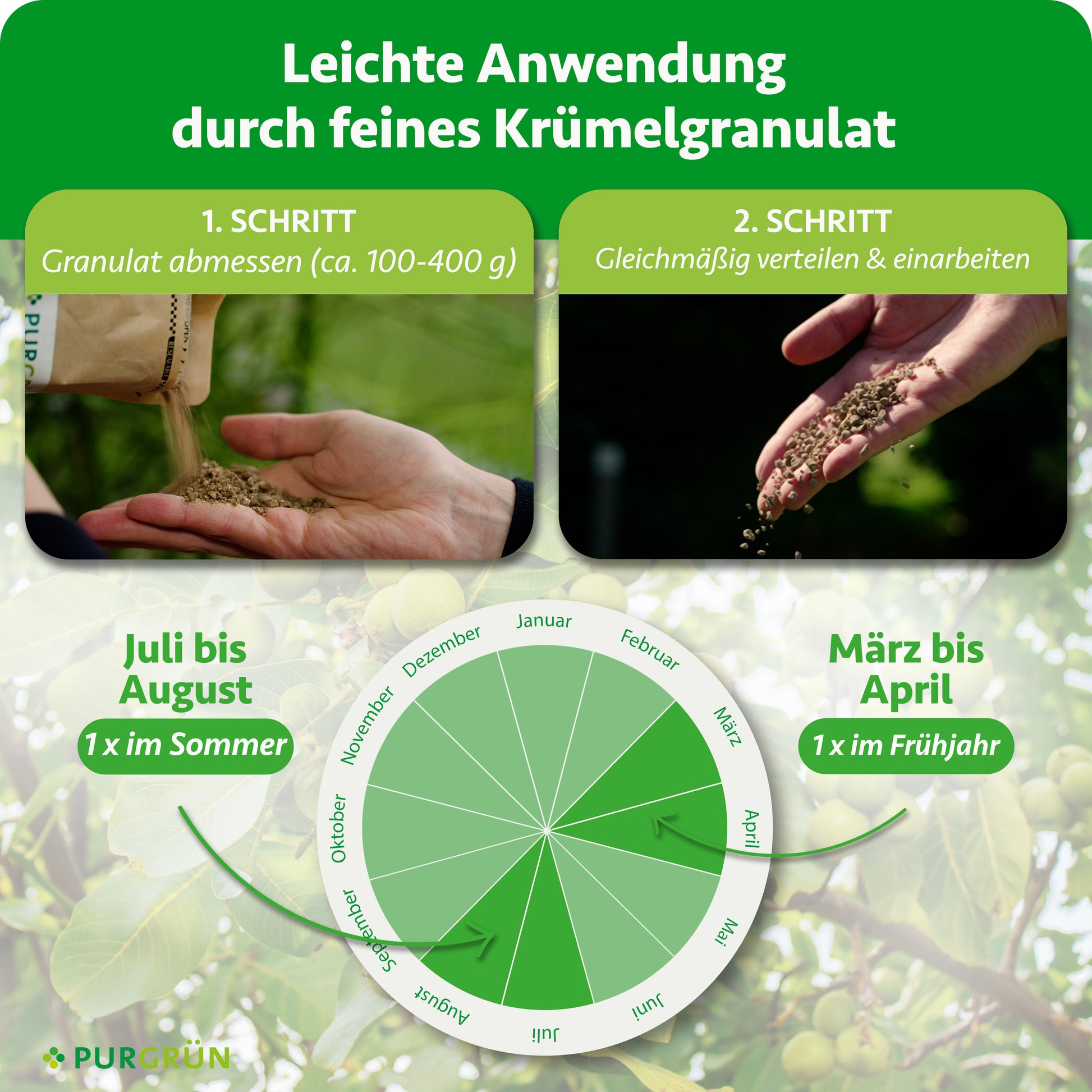 Dank der hohen Ergiebigkeit reicht eine Packung Purgrün Bio-Nussbaum-Dünger für ca. 2-3 Nussbäume.