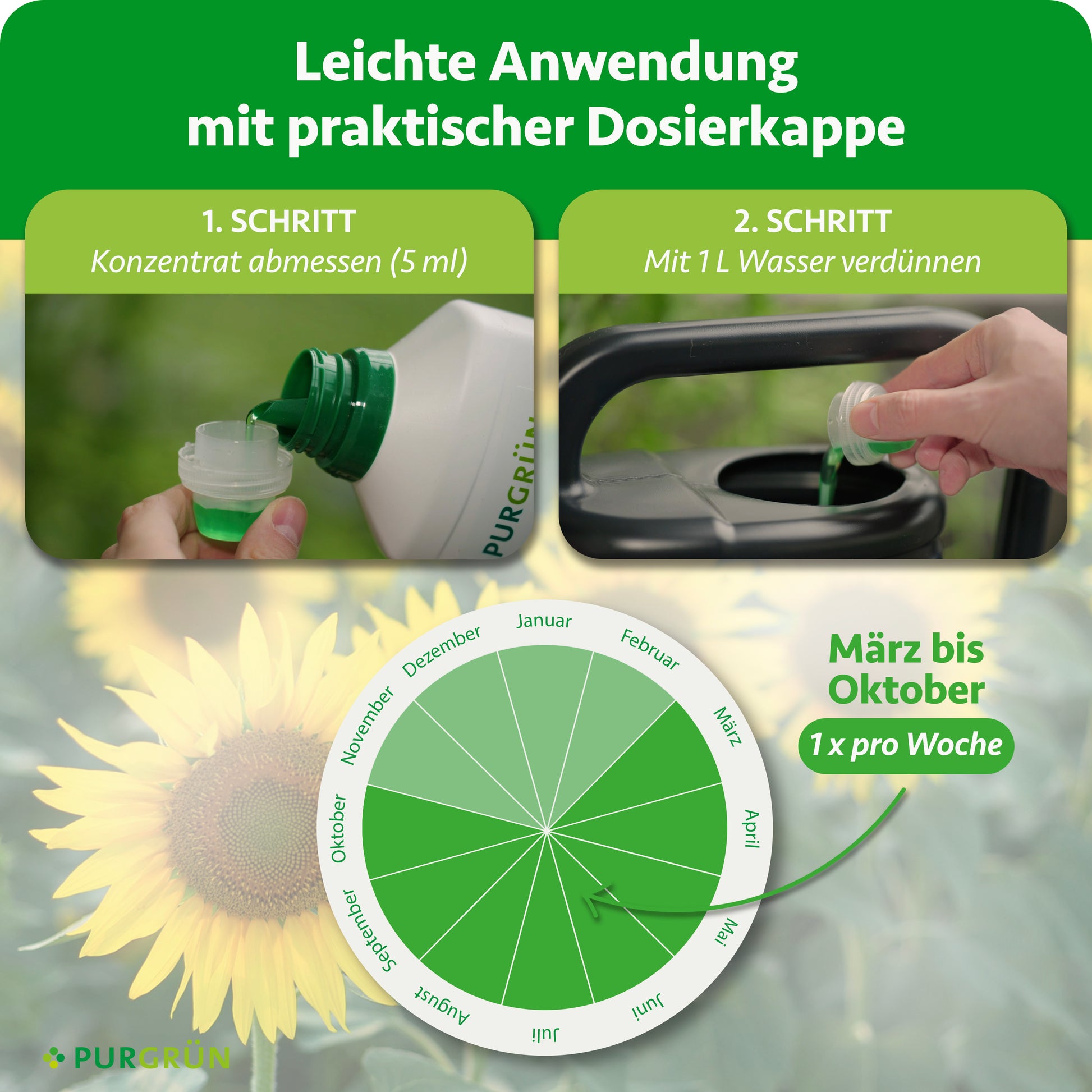Der Purgrün Sonnenblumen-Dünger zeichnet sich durch eine hohe Nährstoffkonzentration aus. Der nährstoffreiche Flüssigdünger wurde speziell entwickelt, um auch den hohen Anforderungen der blühfreudigen Sonnenblumen nachzukommen.